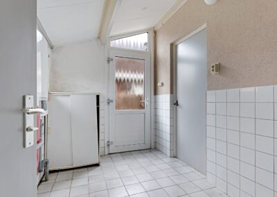 Begane grond: entree met trap naar eerste verdieping, vaste trapkast en meterkast, dichte keuken voorzien van inbouwapparatuur, woonkamer met haard en dubbele vaste kastruimte, bijkeuken met achterentree, toilet met fontein, badkamer voorzien van douche en wastafel.