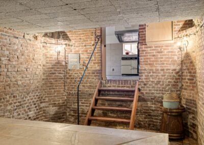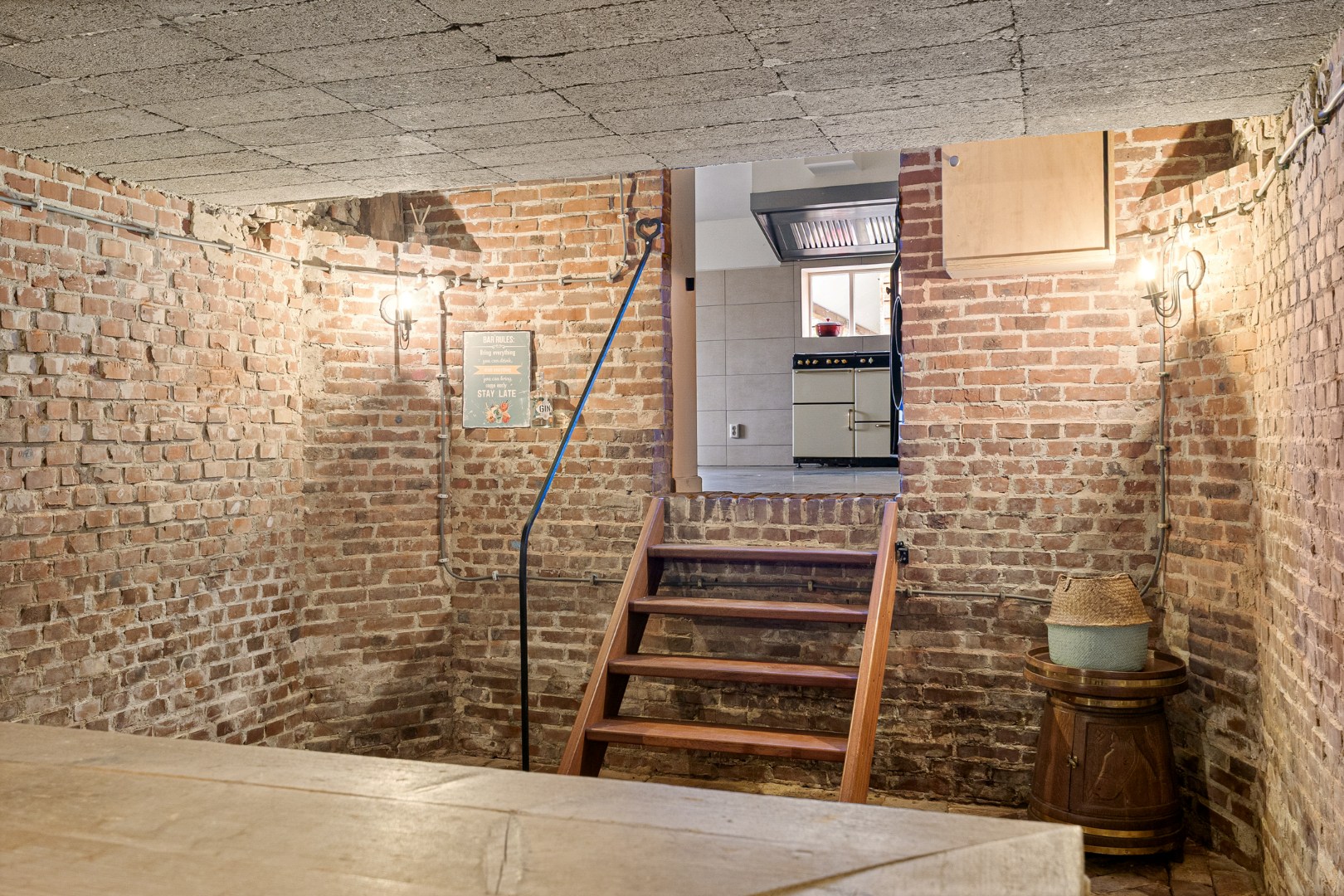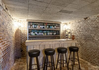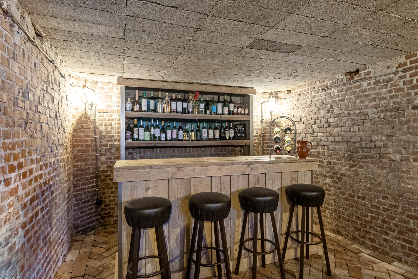 Begane grond: (achterste gedeelte) Ruime keuken, (wijn) kelder met bar, hal met twee toiletten, woonkamer, berging.