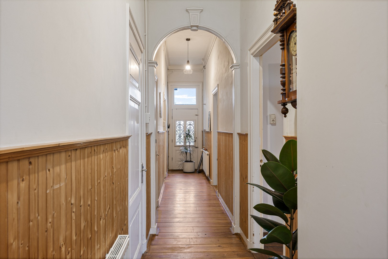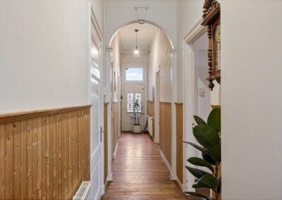 Begane grond: (voorste gedeelte) Entree/hal, eetkamer met vaste kastruimtes en tussenhal naar woonkamer, slaapkamer (13m²), keuken voorzien van inbouwapparatuur, hal met vaste kastruimtes en toilet voorzien van fontein, badkamer voorzien van dubbele wastafel, douche, toilet en ligbad, slaapkamer (24m²), bijkeuken.