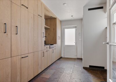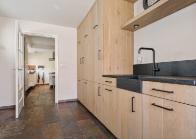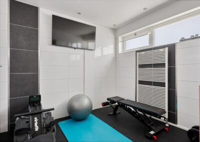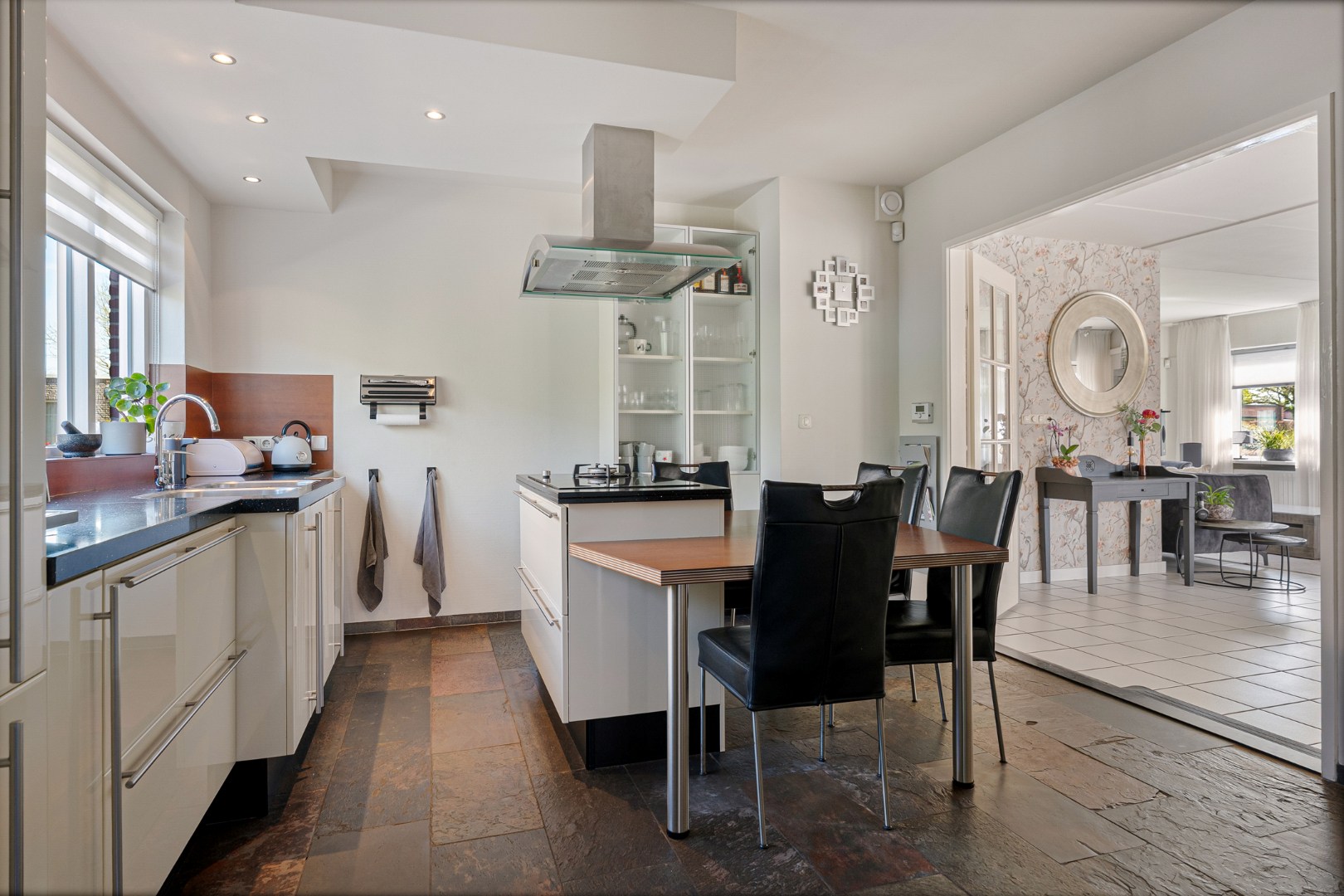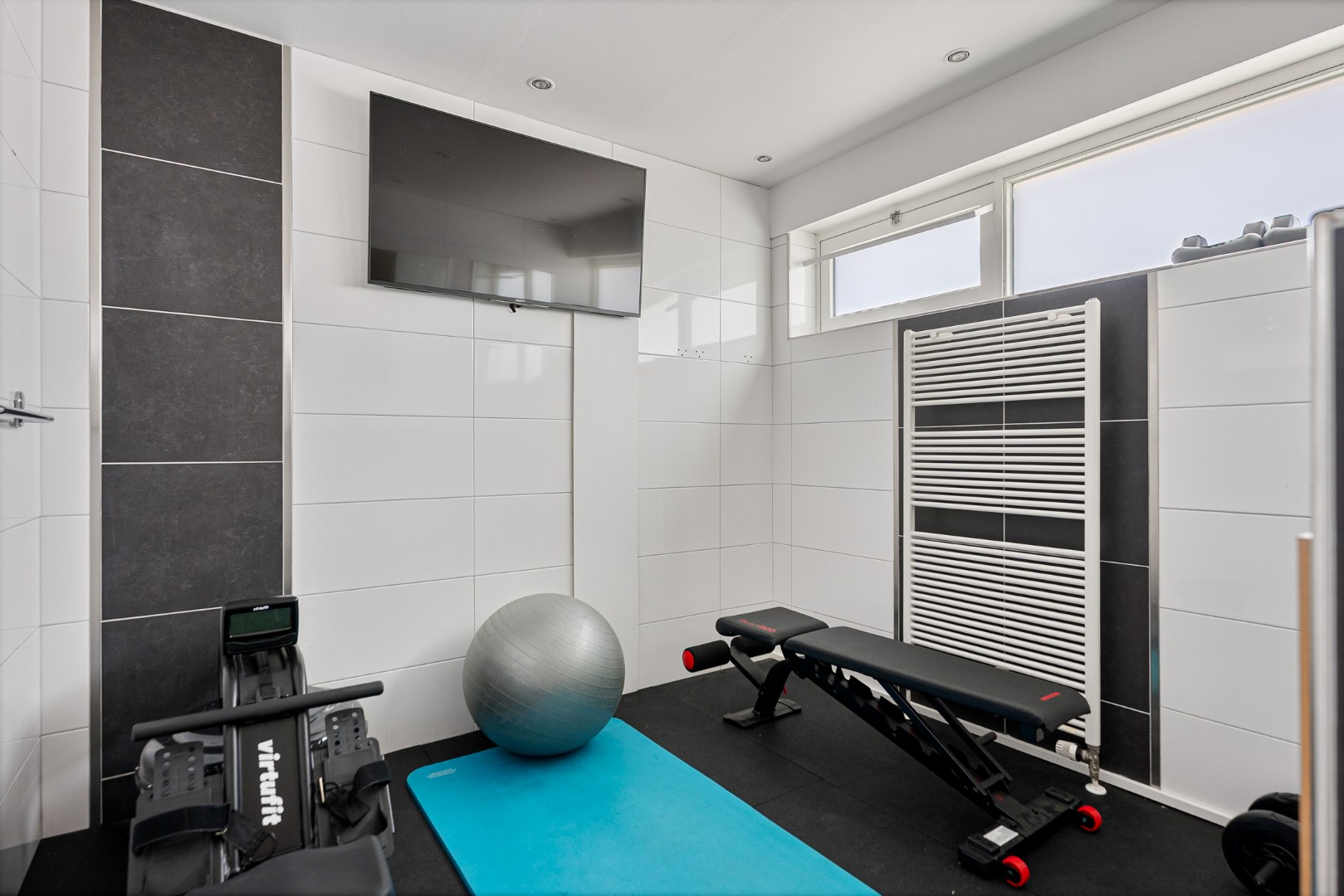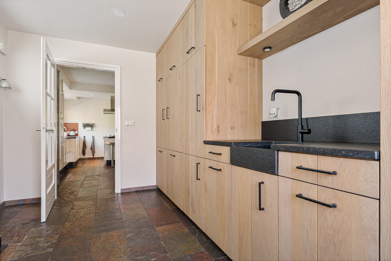 Begane grond: Entree/hal met vaste trap naar verdieping en toilet voorzien van fontein, extra kamer/ sportruimte welke de mogelijkheid biedt om eenvoudig weer een douche te realiseren (7m²), royale woonkamer met twee schuifpuien naar overkapping en openslaande deuren naar de keuken welke is voorzien van inbouwapparatuur, ruime en hoge kelder, bijkeuken met vaste kastruimte en achterentree.