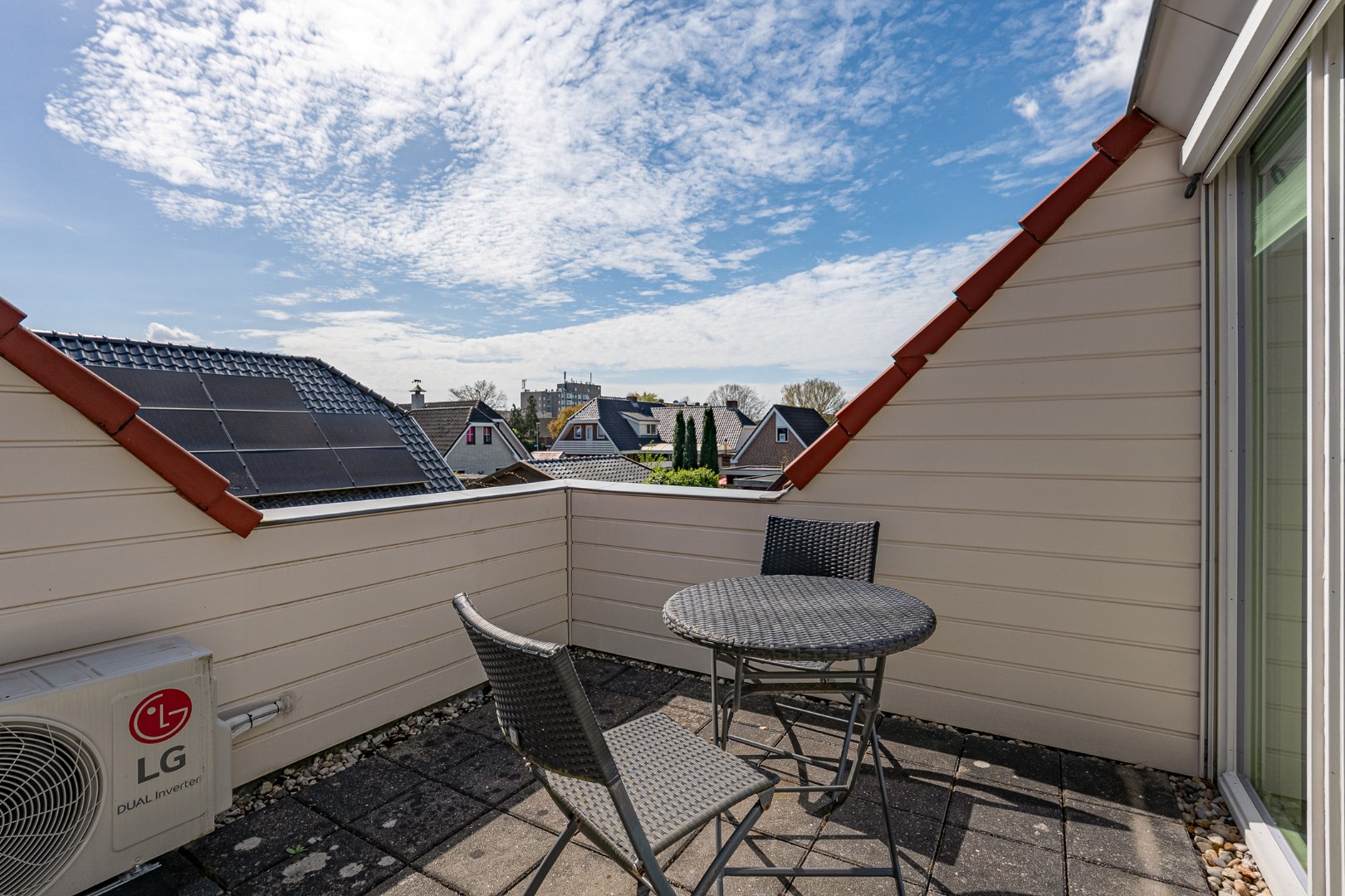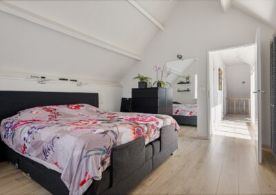 Eerste verdieping: Overloop, vier slaapkamers (6m², 10m² voorzien van vaste kastruimte, 14m² voorzien van vaste kastruimtes en 15m² met vaste kastruimte), dakterras, twee badkamers welke beide zijn voorzien van een toilet en een wastafel met meubel en een douche.