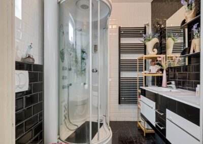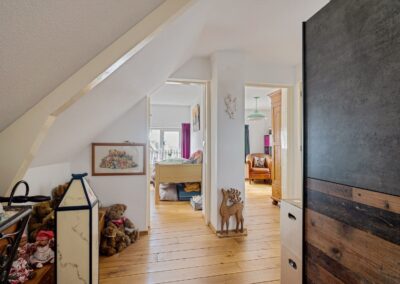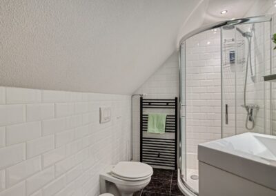 Eerste verdieping: overloop, drie slaapkamers, badkamer voorzien van toilet, wastafel met meubel en douche.
