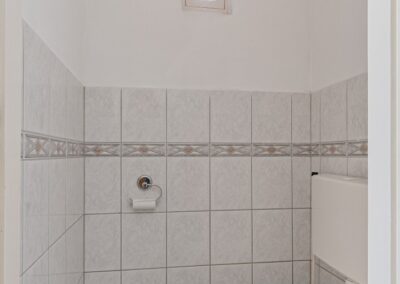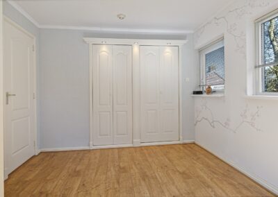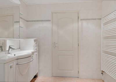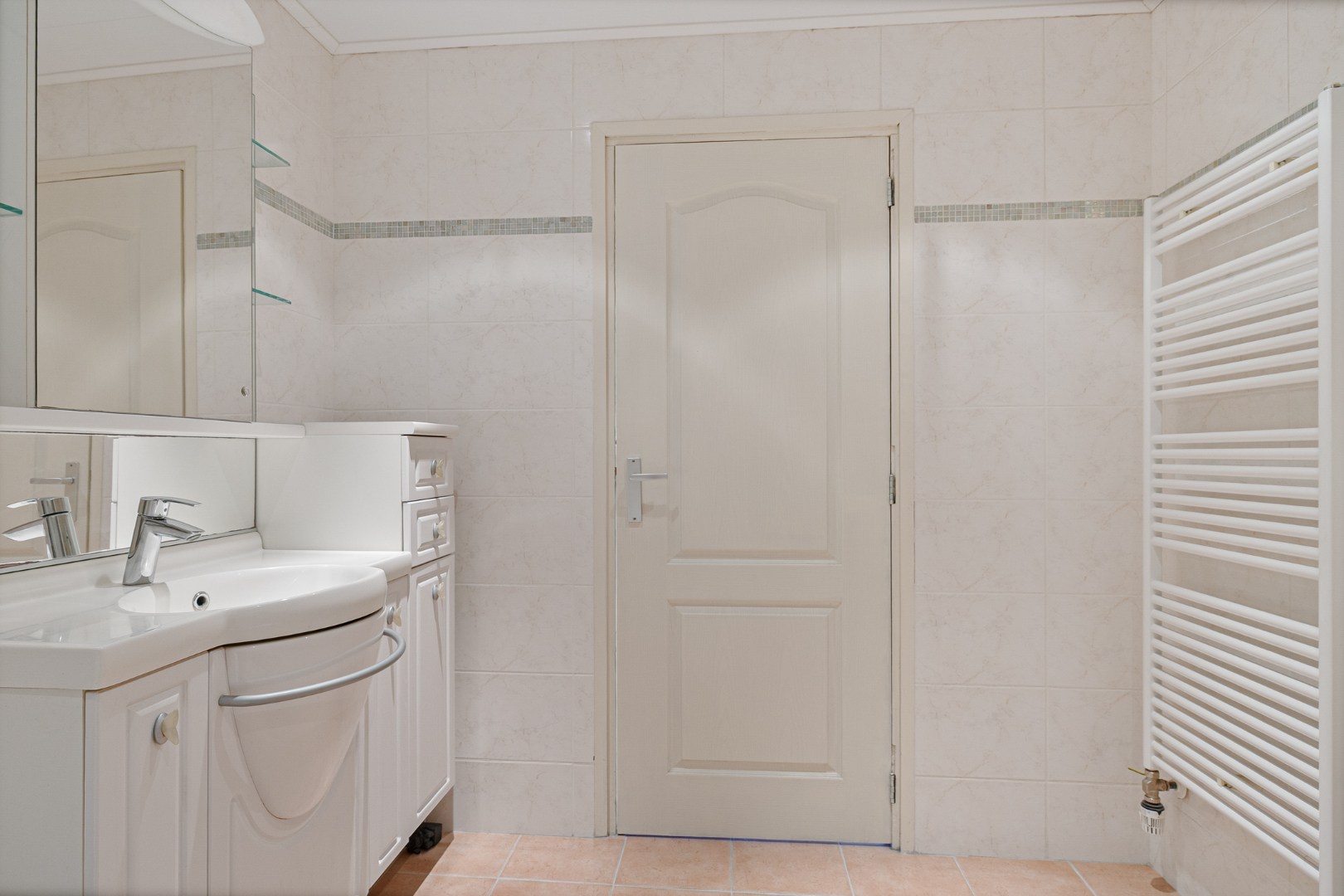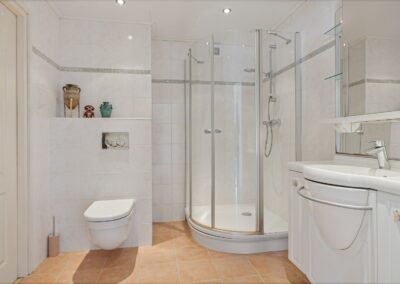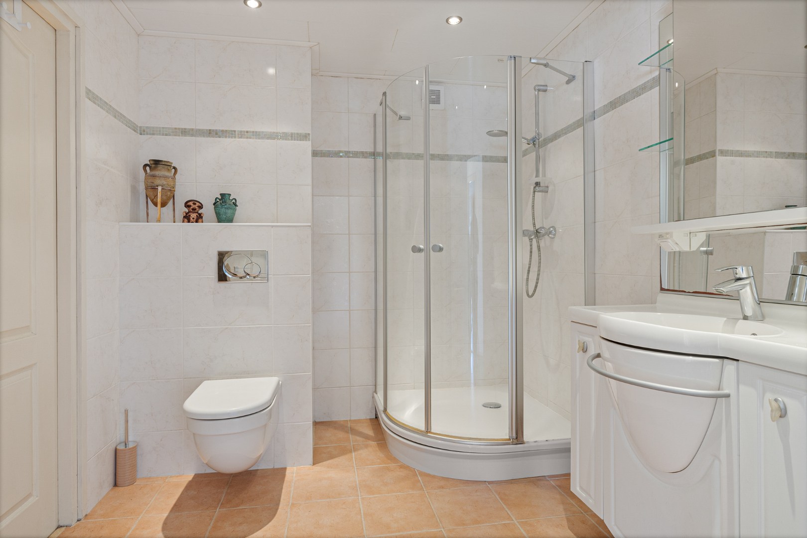 Eerste verdieping: Overloop, drie slaapkamers (8m², 11m² met vaste kastruimte en 12m² met vaste kastruimte), badkamer voorzien van douche, wastafel met meubel en toilet.