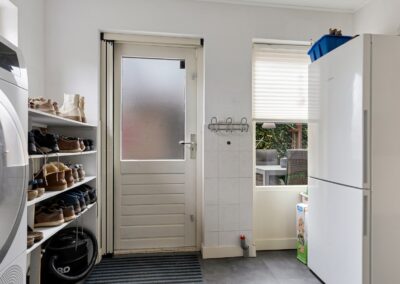 Begane grond: Entree/hal voorzien van trap naar verdieping, meterkast en toilet voorzien van fontein, woonkamer, eetkamer met openslaande deuren naar de tuin, open keuken voorzien van inbouwapparatuur, bijkeuken met achterentree.