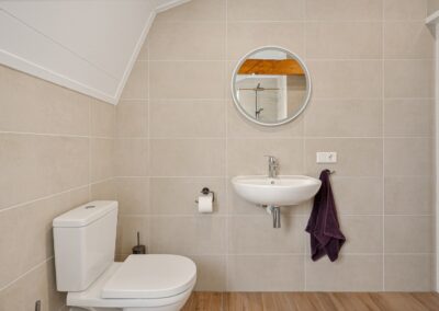 Eerste verdieping: Overloop, twee slaapkamers (25m² met vaste kastruimte en 8m²), badkamer voorzien van wastafel met meubel, toilet en douche, open keuken voorzien van inbouwapparatuur, ruime woonkamer.