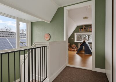Eerste verdieping: Overloop met vaste kastruimte, twee slaapkamers (9m² en 9m²).