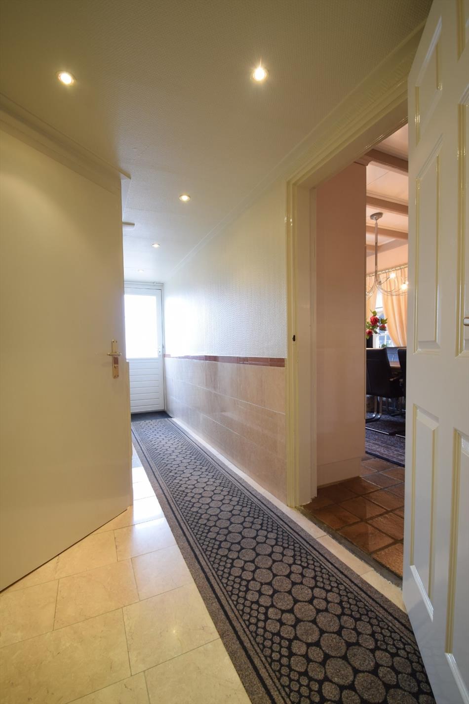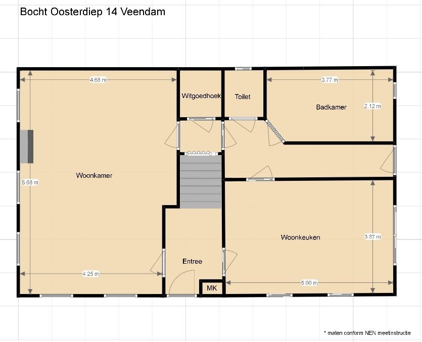 Begane grond: entree/hal met meterkast, trapopgang, woonkamer, woonkeuken, achterentree met aparte ruimte voor witgoedapparatuur, toilet en badkamer met vaste wastafel, douchecabine en ligbad.