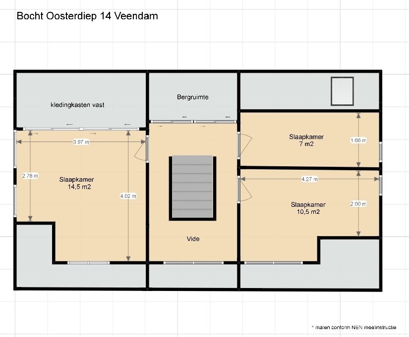 Conform meetinstructie NEN-normering 2580 op locatie ingemeten: totaal gebruiksoppervlakte wonen 86m², overige inpandige ruimte 28m², externe bergruimte 12,25m², bruto inhoud woning 290m³.